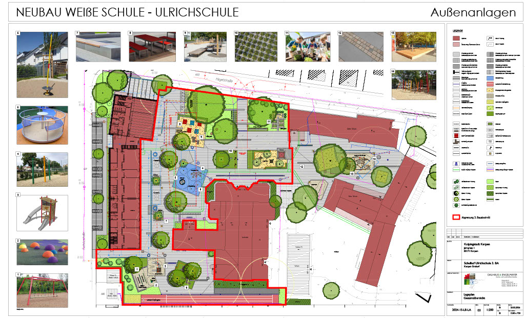 Im Anschluss wird der Pausenhof entlang des neuen weißen Gebäudes abschnittsweise umgebaut. Der Schulhof wird bis zum Uhrenturm komplett neu gestaltet. Es wird Sitzgelegenheiten, Spielgeräte und einen Schulgarten geben.