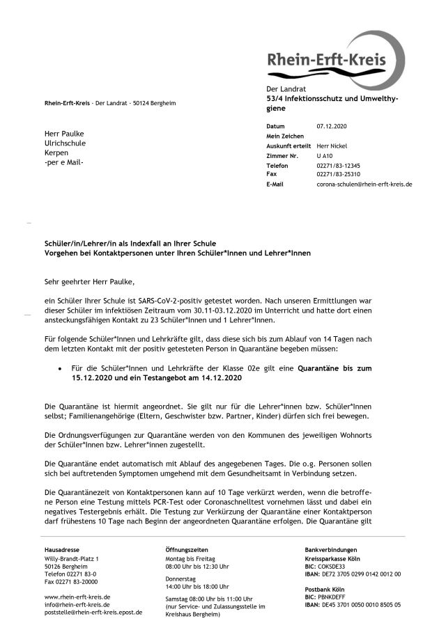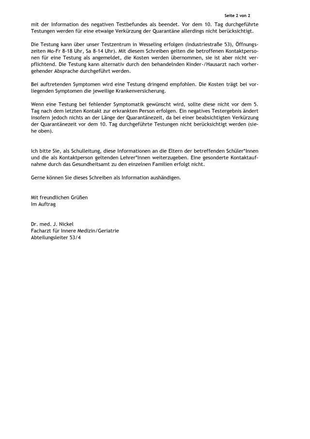 heute erreicht uns das angekündigte Schreiben des Gesundheitsamtes mit weiteren Informationen zu den Quarantänezeiten Ihres Kindes.