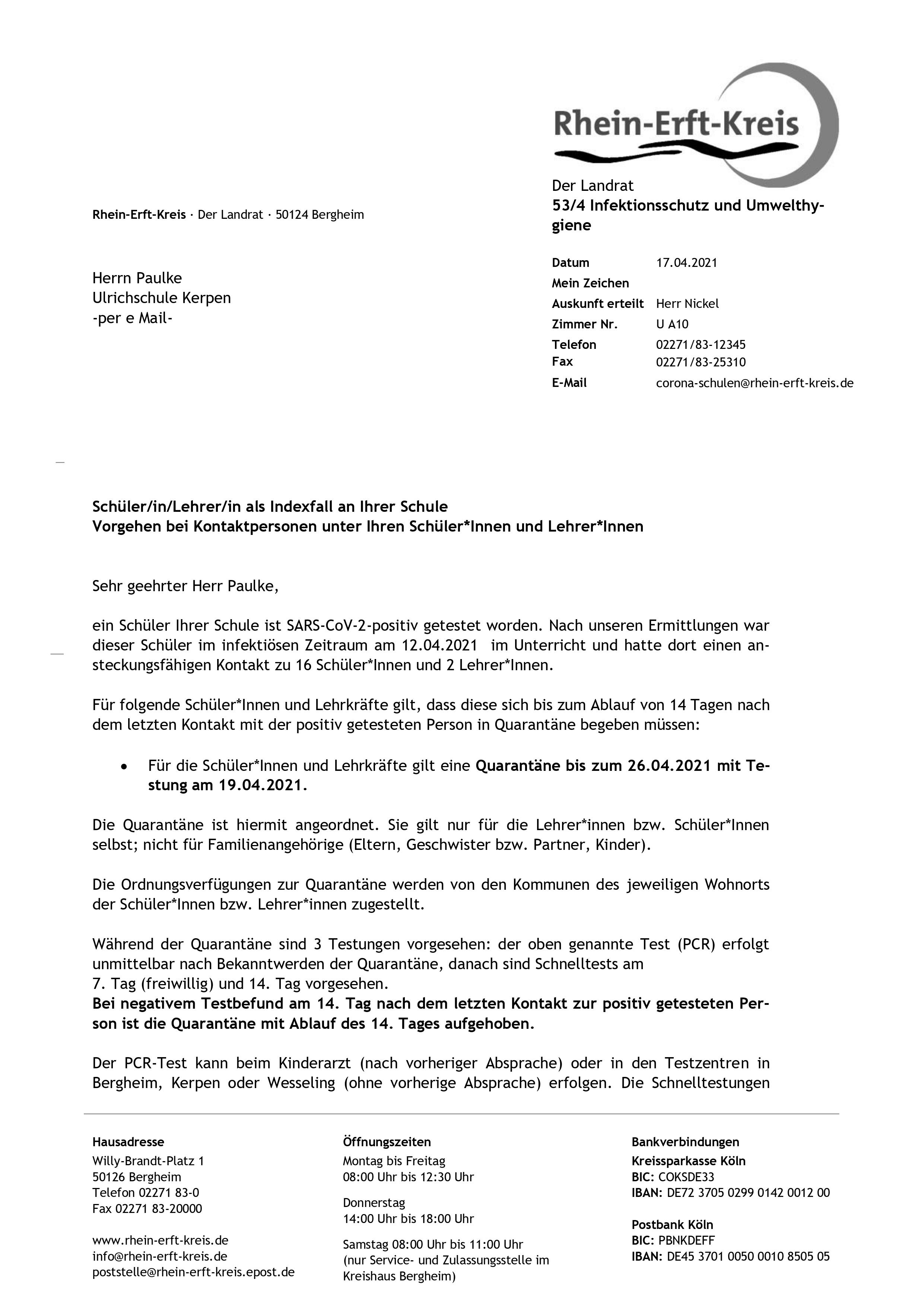 Alle Personen müssen bis zum Montag, dem 26.04.2021 in Quarantäne.