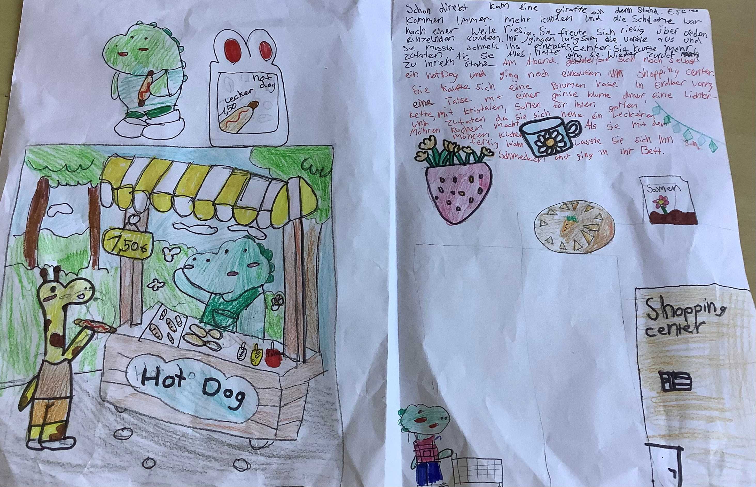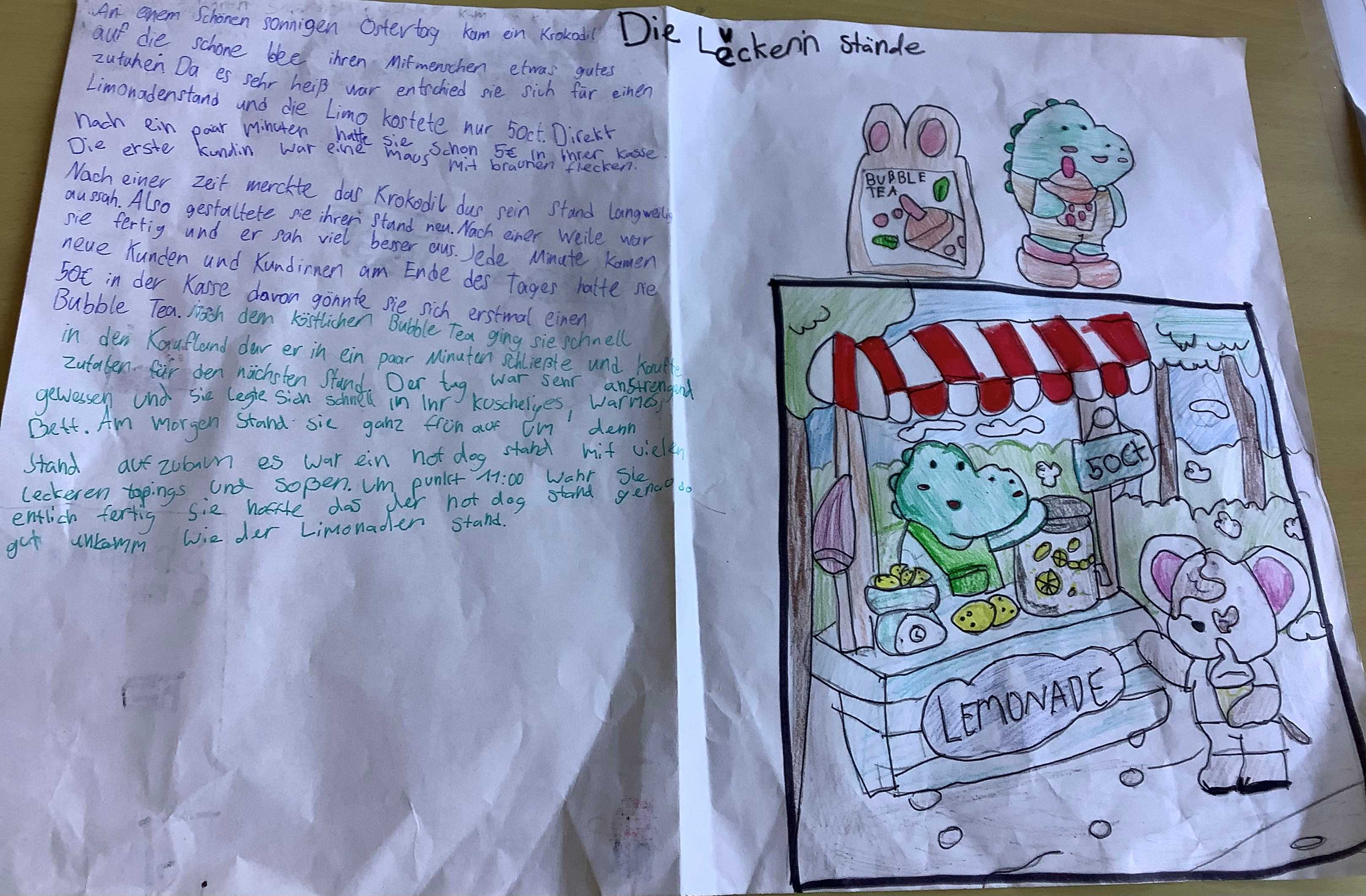 „An einem schönen sonnigen Ostertag kam ein Krokodil auf die schöne Idee ihren Mitmenschen etwas Gutes zu tun. Da es sehr heiß war, entschied sie sich für einen Limonadenstand und die Limo kostete nur 0.50€. Direkt nach ein paar Minuten hatte sie schon 5€ in ihrer Kasse. Die erste Kundin war eine Maus mit braunen Flecken. Nach einer Zeit merkte das Krokodil, dass sein Stand langweilig aussah. Also gestaltete es seinen Stand neu. Nach einer Weile war er fertig und er sah viel besser aus. Jede Minute kamen neue Kunden und Kundinnen. Am Ende des Tages hatte es 50€ in der Kasse, davon gönnte es sich erstmal einen Bubble Tea. Nach dem köstlichen Bubble Tea ging es schnell in den Kaufland, der in ein paar Minuten schließte und kaufte Zutaten für den nächsten Stand. Der Tag war sehr anstrengend gewesen und es legte sich schnell in sein kuscheliges, warmes Bett. Am Morgen stand es ganz früh auf, um den Stand aufzubauen. Es war ein Hotdog-Stand mit vielen leckeren Toppings und Soßen. Um Punkt 11:00 Uhr war er endlich fertig. Es hoffte, dass der Hotdog-Stand genauso gut ankam, wie der Limonaden-Stand. Schon direkt kam eine Giraffe an den Stand. Es kamen immer mehr Kunden und die Schlange war nach einer Weile riesig. Das Krokodil freute sich riesig über jeden einzelnen Kunden. Ihm gingen langsam die Vorräte aus und es musste schnell ins Einkaufszentrum. Das Krokodil kaufte mehr Zutaten. Als es alles hatte, ging es wieder zurück zu ihrem Stand. Am Abend gönnte sie sich noch selbst ein Hotdog und ging einkaufen im Shoppingcenter, Sie kaufte sich eine Blumenvase in Erdbeerform, eine Tasse mit einer Gänseblume drauf, eine Lichterkette mit Kristallen, Samen für ihren Garten und Zutaten, da sie sich heute einen leckeren Möhrenkuchen macht. Als sie mit dem Möhrenkuchen fertig war, ließ sie sich ihn schmecken und ging in ihr Bett. “