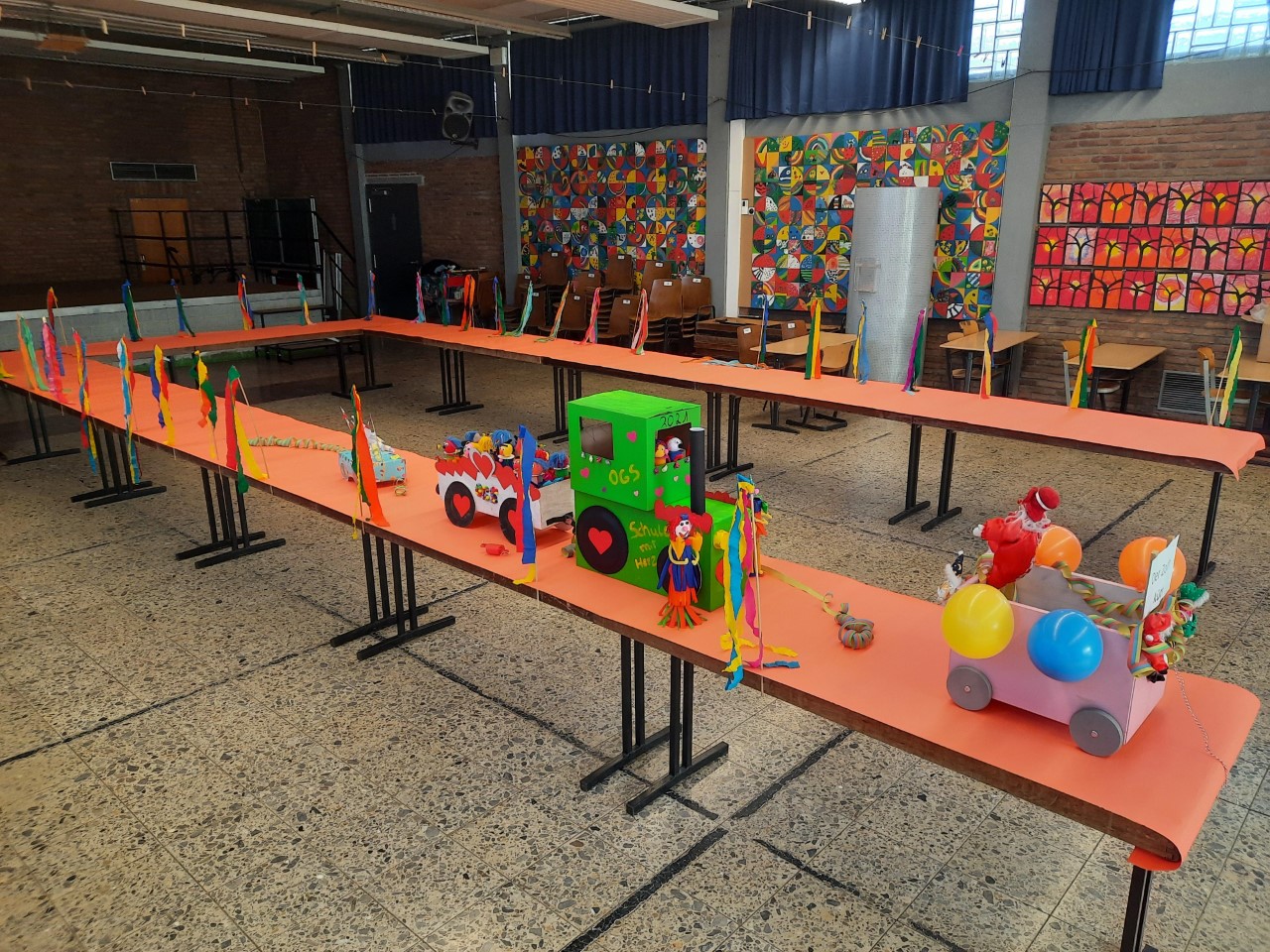 Am Karnevalsdienstag, zum Materialtauschtag, kannst du deinen gebastelten Wagen mit in die Aula bringen, wir haben dort Tische aufgebaut, drei Wagen sind bereits angekommen, schau mal:
