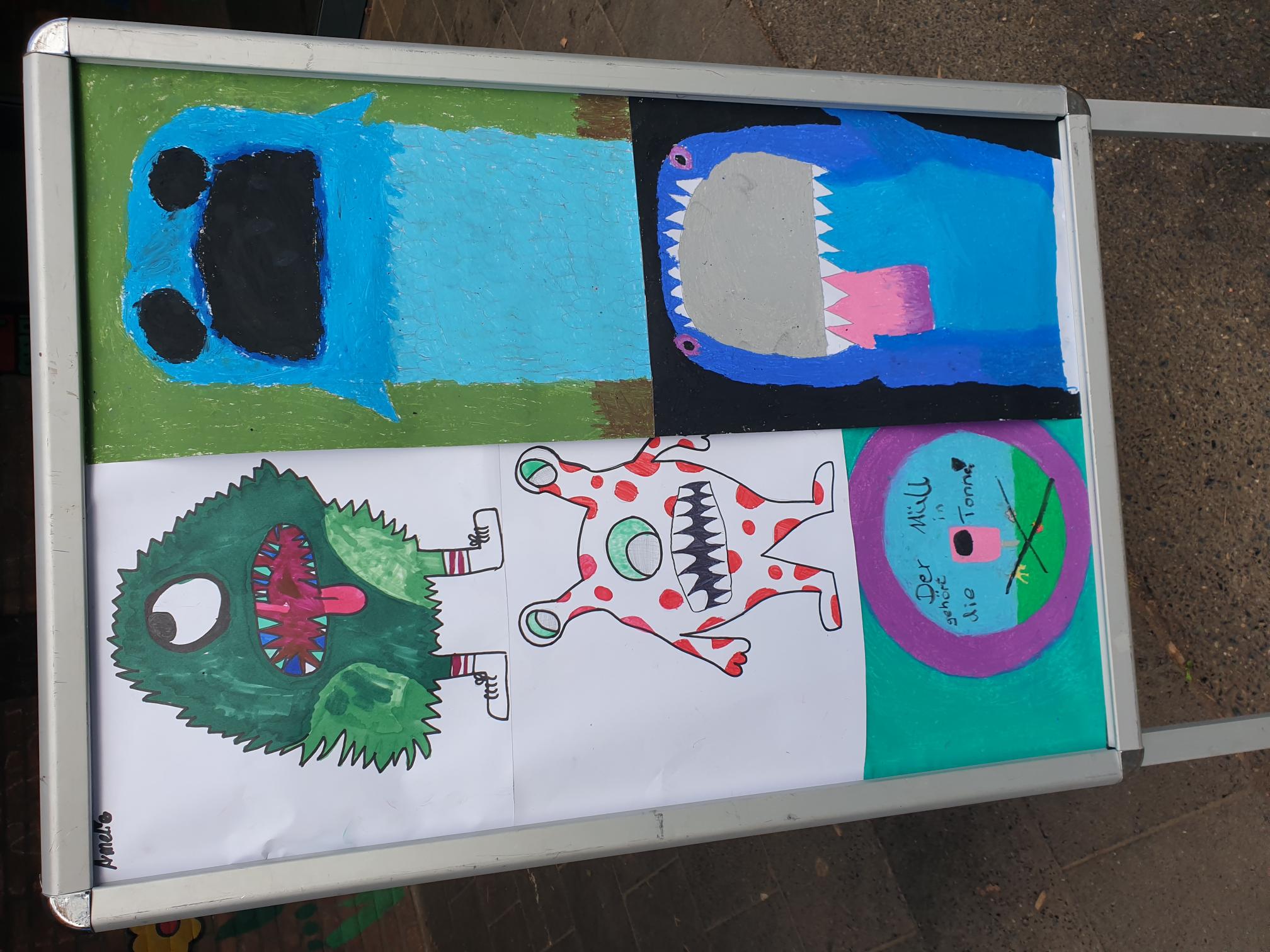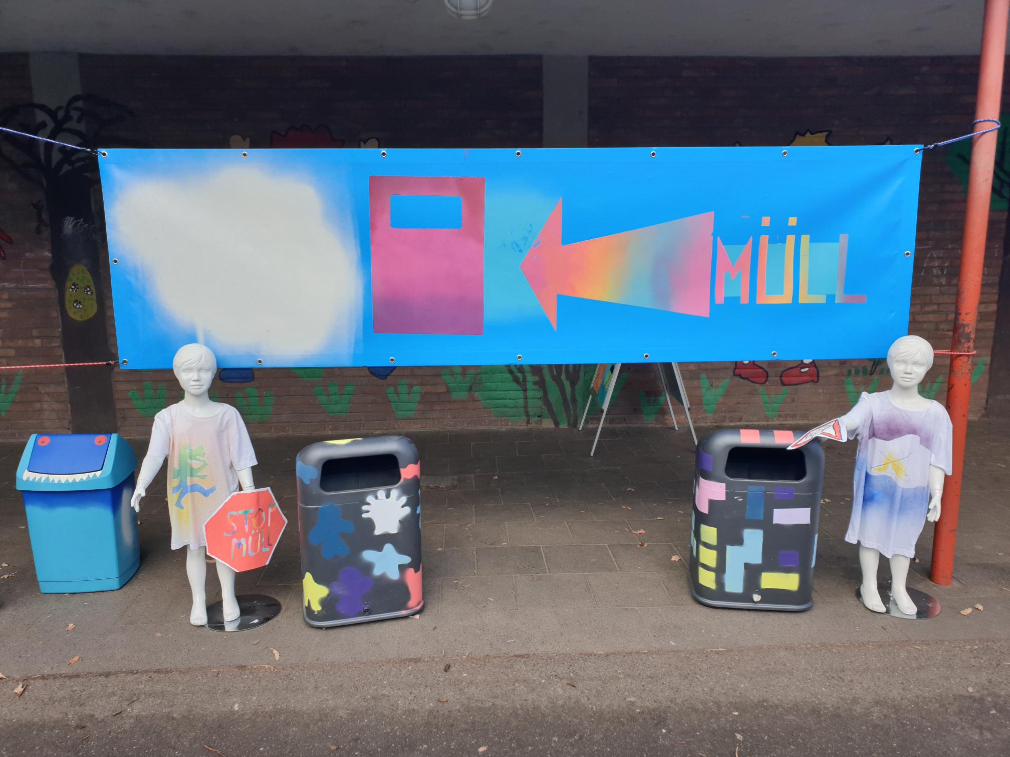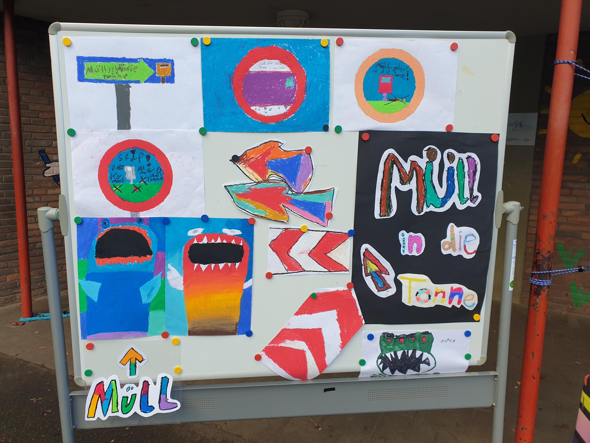 Daher haben die Kinder im Kinderparlament entschieden, Hinweisschilder und Banner zu entwerfen, die auf die Mülleimer hinweisen. Außerdem wurden auch Mülleimer gestaltet, damit diese mehr auf dem Schulgelände auffallen. Die Banner und Schilder werden in den kommenden Tagen aufgehängt, die Mülleimer sollen auf dem neu gestaltetem Schulhof aufgestellt werden. Dies sind einige Ergebnisse: