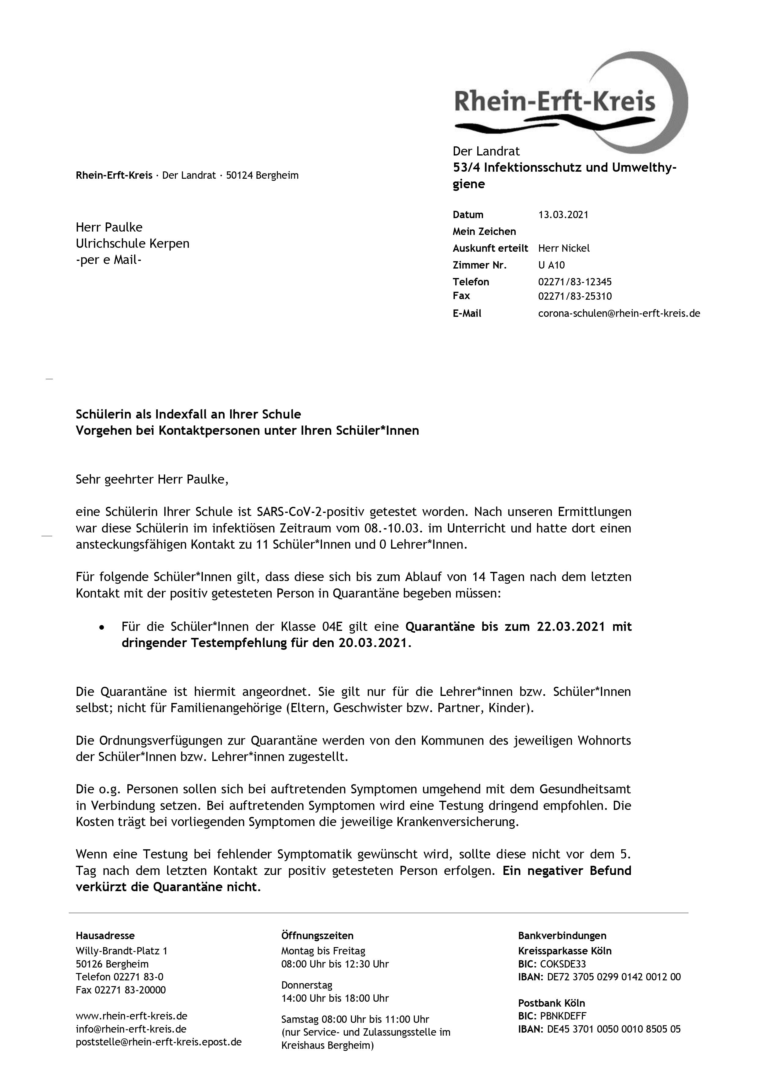 Heute morgen erreichte mich das Schreiben des Gesundheitsamtes mit weiteren Informationen zu den Quarantänezeiten Ihres Kindes. Das Schreiben finden Sie am Ende des Beitrages.