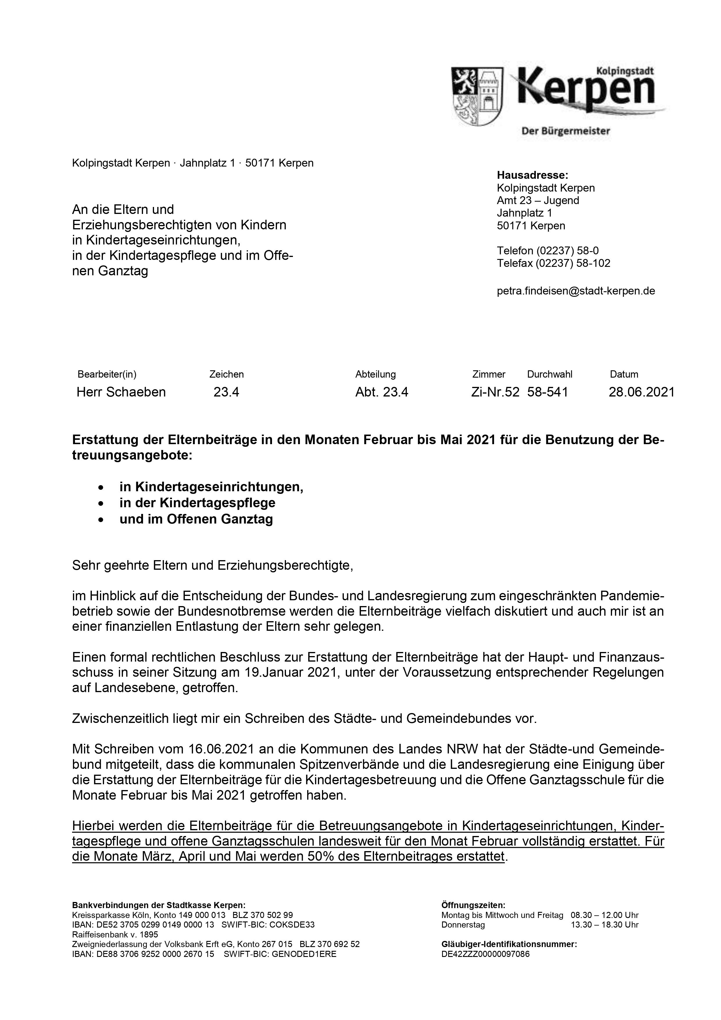 die Kolpingstadt Kerpen hat uns gebeten das Schreiben unten zu veröffentlichen. Es geht um Ihre OGS-Beiträge.