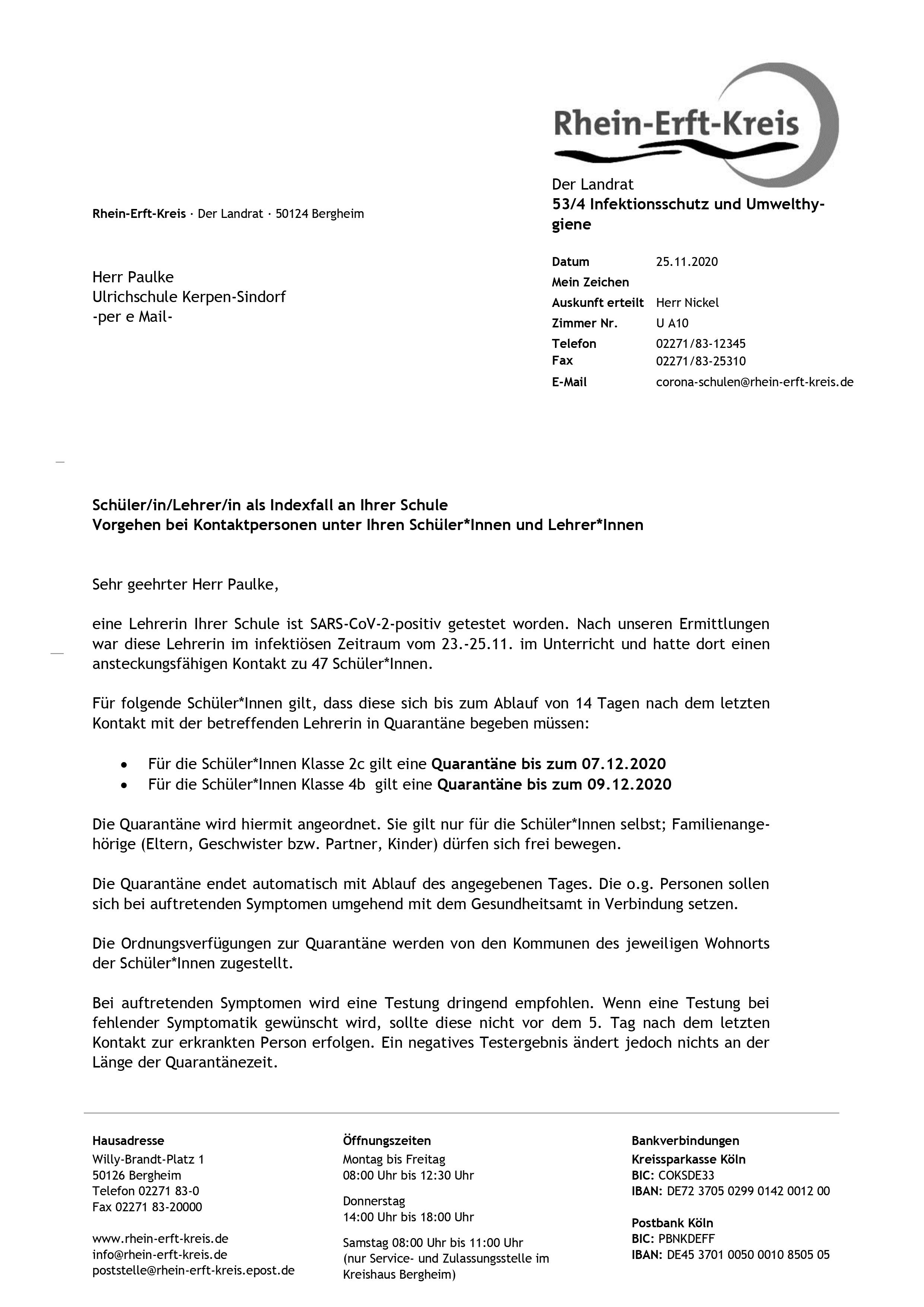 Anschreiben des Gesundheitsamtes Coronafall 25.11.2020